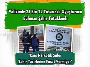 Kars'ta narkotik ekiplerinin titiz çalışması sonucu valizinde 25 Bin TL tutarında uyuşturucu madde bulunan şahıs çıkartıldığı mahkemece tutuklanarak cezaevine gönderildi.