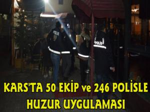 Kars Güncel- Kars İl Emniyet Müdürlüğünden yapılan açıklamada; "Kars İl Emniyet Müdürlüğü görevlilerimizce 09/11/2018 günü 09:00-23:00 saatleri arasında il merkezi ve ilçelerimizde 50 ekip ve 246 personelin katılımı ile eş zamanlı yapılan TÜRKİYE GÜVEN HUZUR (2018-8) adlı Asayiş Huzur Uygulaması sonucunda; Toplam 2.152 şahsın GBT kayıtları sorgulanmış, Basit Yaralama suçundan aranan 1 şahıs yakalanmış, 2 şahsa adli idari işlem uygulanmıştır.