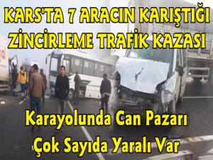 Kars Güncel- Kars'ın Sarıkamış ilçesinde bu gün sabah sat saatlerinde trafik kazası meydana geldi. 7 aracın kazıştığı trafik kazasında ilk belirlemelere göre 20 nin üzerinde yaralı oluğu öğrenildi. Olay yerine çağrılan sağlık ekiplerince yaralılar ilçe devlet hastanesinde tedavi altına alındı.