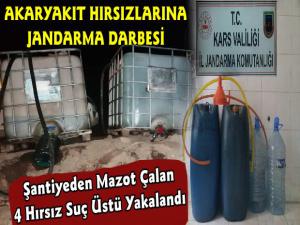 Kars Güncel- Kars Valiliği'nden yapılan açıklamada; "İl Jandarma Komutanlığımız tarafından 28.10.2019 tarihinde ilimiz Sarıkamış İlçesi Çatak Köyü mevkiinde Kızılçubuk Baraj Göleti inşaat şantiyesine ait araç ve akaryakıt sahasında ellerinde ve araçlarında bulunan bidon, hortum ve huni ile akaryakıt çalmaya çalışan dört şahıs suçüstü yakalanmıştır.