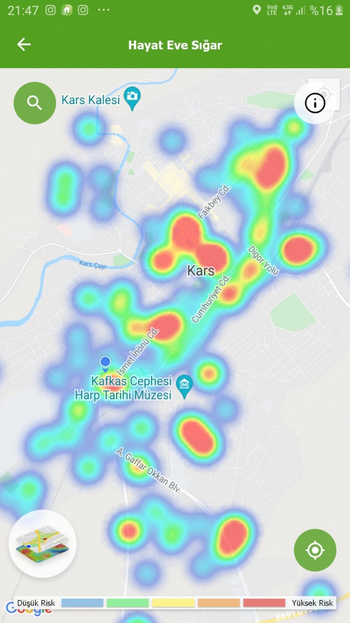 Sağlık Bakanlığı'nın Hayat Eve Sığar uygulamasında Kars kent merkezinde kırmızı alanların arttığı görüldü. Kent merkezinde salgın denetim ekipleri son günlerde vatandaşları maske ve mesafe konusunda uyarılarını arttırdı.