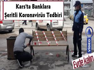 Kars'ta belediye ekipleri, yeni tip koronavirüs (Kovid-19) tedbirleri kapsamında cadde üzerinde bulunan banklara emniyet şeridi çekti.
