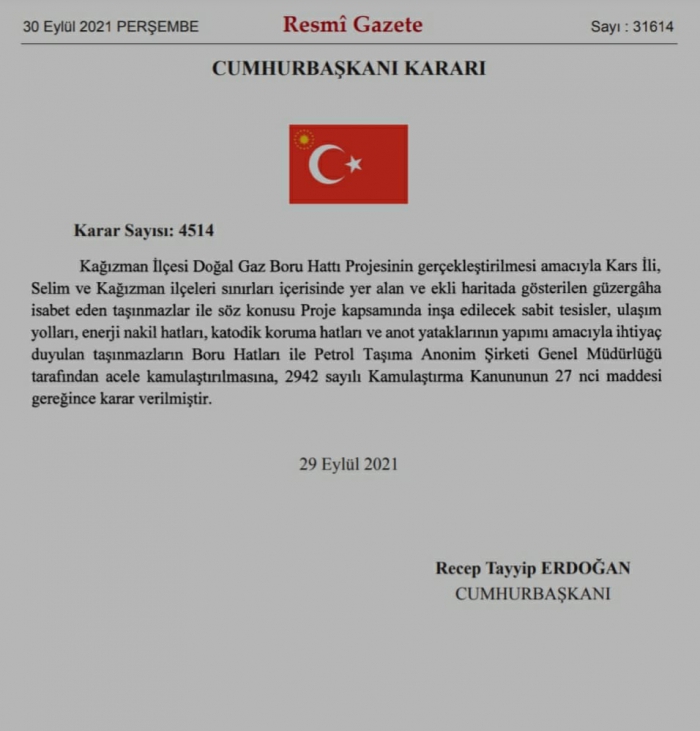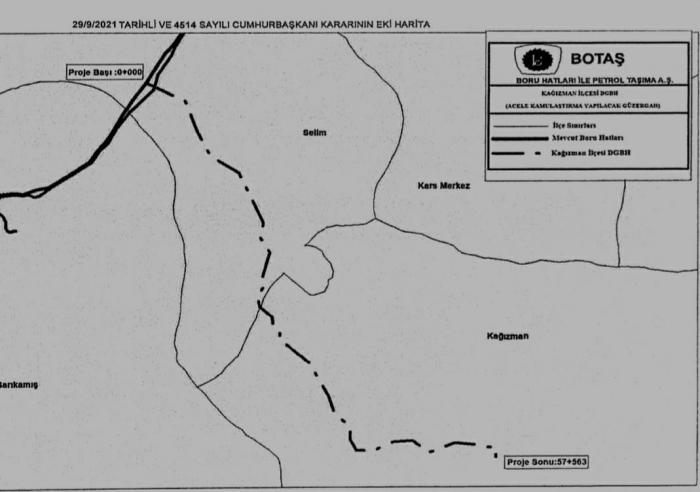 Kars Güncel-Kars'ın Kağızman ilçesinde BOTAŞ tarafından tesis edilecek doğalgaz iletim hattı için Selim/Kağızman ilçeleri arasında bulunan proje güzergahındaki alanlar için acele kamulaştırma kararı alındı.