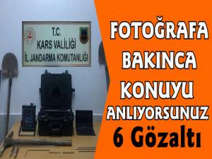 Kars Güncel- Valilikten yapılan açıklamada; "Kars İl Jandarma Komutanlığımızca; alınan bir duyum üzere yapılan titiz planlama, çalışma ve takip sonucunda, Merkez İlçesi Soylu Köyü Ziyaret Tepe mevkiinde 02.05.2020 günü izinsiz kazı yapan (6) şüpheli şahıs suç aletleri ile birlikte ele geçirilmiştir.