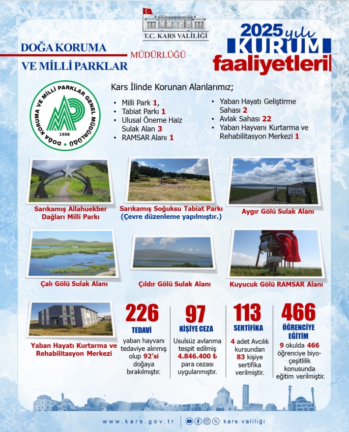 Kars Valiliği Doğa Koruma ve Milli Parklar Müdürlüğü, 2025 yılı boyunca il genelinde doğanın korunması, biyolojik çeşitliliğin sürdürülebilirliği ve çevre bilincinin artırılmasına yönelik kapsamlı çalışmalar gerçekleştirdi.