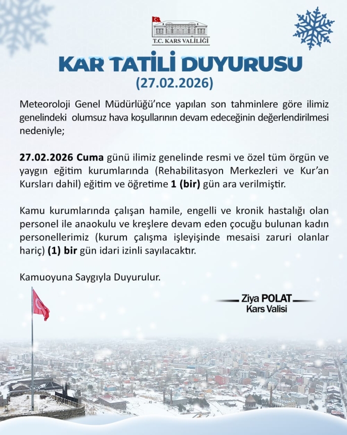 Valilikten yapılan açıklamaya göre, 27 Şubat 2026 Cuma günü il genelindeki resmi ve özel tüm örgün ve yaygın eğitim kurumlarında (Rehabilitasyon Merkezleri ve Kur’an Kursları dahil) eğitim ve öğretime 1 (bir) gün ara verildi.