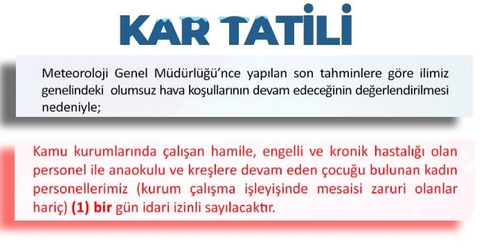 Ayrıca kamu kurumlarında görev yapan hamile, engelli ve kronik hastalığı bulunan personel ile anaokulu ve kreşe devam eden çocuğu bulunan kadın personel (kurum işleyişinde mesaisi zaruri olanlar hariç) 1 gün idari izinli sayılacak.