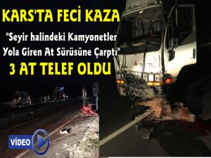 Edinilen bilgiye göre Kars Ardahan karayolu Kırkpınar Köyü yakınlarında seyir halinde olan kamyonetler, karayoluna inen başıboş at sürüsüne çarptı. Çarpmanın etkisiyle iki kamyonette büyük hasar oluştu. Olay yerine çağrılan sağlık ekipleri tarafından yaralanan araç sürücüleri ambulansla Kars'ta bulunan hastanelere kaldırılırken kamyonetlerin çarptığı üç at ise telef oldu.