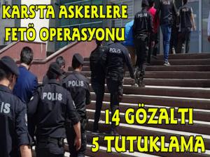 Kars Güncel- Kars İl Emniyet Müdürlüğü'nden Yapılan Yazılı Açıklamada: "Kars İl Emniyet Müdürlüğü, Terörle Mücadele ve İstihbarat Şube Müdürlüğümüz görevlilerince FETÖ/PDY Terör Örgütünün faaliyetlerinin deşifre edilmesine yönelik yürütülen çalışmalar kapsamında; TSK mensupları içerisine sızan ve FETÖ/PDY silahlı terör örgütü üyeleri ile irtibatlı olduğu tespit edilerek yurt genelinde değişik illerde yapılan çalışmalar neticesinde (1) Yarbay, (2) Yüzbaşı, (1) Üsteğmen, (8) Astsubay, (1) Uzman Çavuş ve Harp Okulunda Sözleşmeli Subay Öğrencisi iken İhraç olan (1) şahıs olmak üzere toplam 14 şüpheli yakalanarak gözaltına alınmıştır. Adli mercilere sevk edilen bu şahıslardan;