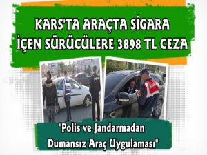 Kars'ta İl Jandarma Komutanlığı ekipleri tarafından yapılan "Dumansız Araç" uygulaması kapsamında; "karayollarında seyir halindeki araçlarda tütün ve tütün mamullerini tüketen şahıslara yönelik 241 personelin katılımı ile 46 noktada Dumansız Araç Türkiye Huzur ve Güven Uygulaması icra edilmiştir.