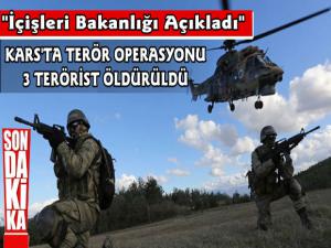Kars Güncel-İçişleri Bakanlığı'ndan yapılan açıklamada; " İç Güvenlik Operasyonları kapsamında; Kars Kağızman Madur kırsalında, İl Jandarma Komutanlığınca bugün gerçekleştirilen hava destekli operasyonda 3 terörist, silahlarıyla birlikte etkisiz hale getirildi. Bölgede operasyonlar devam etmektedir." denildi.