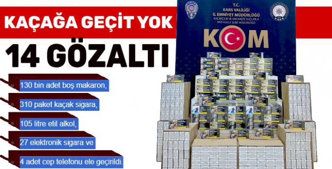 Kars'ta Kaçakçılık ve Organize Suçlarla Mücadele (KOM) ekiplerince düzenlenen operasyonda çok sayıda gümrük kaçağı ürün ile etil alkol ele geçirildi. Operasyon kapsamında 14 şüpheli gözaltına alındı.