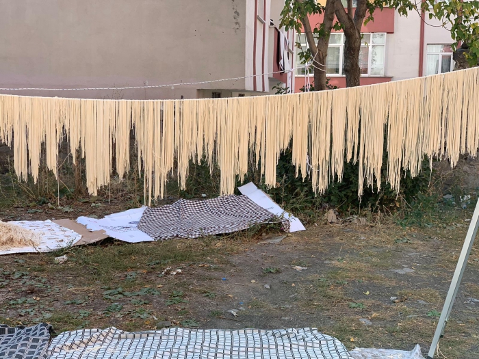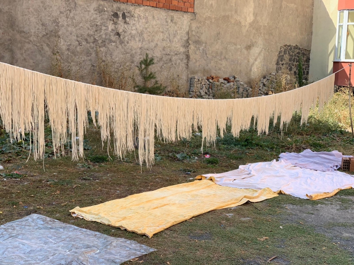 Kars Güncel- Kars'ta ev hanımları adeta ipe un seriyorlar. Kış mevsimi öncesinde ilçe merkez ve köylerde yaşayan ev hanımları bir araya gelerek kışlık eriştelerini kesiyorlar. Un, süt ve yumurta karışımı ile açılan hamurlar bir makina yardımı ile kesiliyor. Rulo haline gelen erişteler ise adeta çamaşır gibi iplere seriliyor. Kısa bir süre ipte kalan erişteler kuruduktan sonra alınarak saklama kaplarına konuyor.