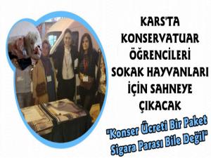 Kars Güncel-Kars Kafkas Üniversitesi Konservatuar bölümünde öğrenim gören öğrencilerden oluşan koro ve Kars Can Dostlar Dernegi sokak hayvanlarının barınma sorunlarını azaltmak ve diğer ihtiyaçlarını karşılamak için 10 TL karşılığında 3 seanstan oluşan konser düzenleyecekler. Kars Valiliği tarafından verilen yasal izin sonrasında sokak hayvanları yararına bilet satışları başladı.
