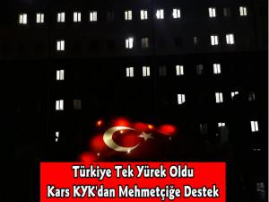 Kars Güncel- Yurt odalarında ışıklar TSKyı aydınlattı, bayraklar açıldı, vatan ve bayrak sloganları atıldı. Islıklarla TSKya destek veren öğrenciler açtıkları dev Türk bayrakları etrafında birlik ve beraberlik mesajı verdiler.