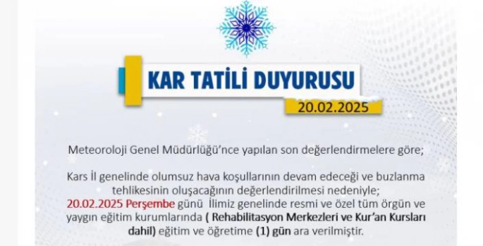 Valilikten yapılan açıklamaya göre, Kars genelinde yoğun kar yağışının sürmesi ve buzlanma riskinin devam etmesi sebebiyle resmi ve özel tüm örgün ve yaygın eğitim kurumlarında eğitime ara verilecek. (Üniversiteler hariç)