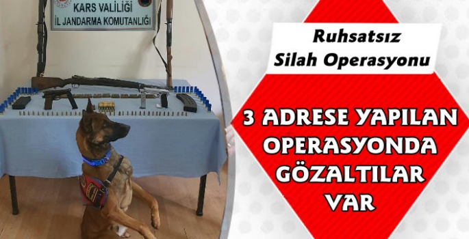 Kars Güncel- Valilikten yapılan açıklamada; "İl Jandarma Komutanlığı ve Selim İlçe Jandarma Komutanlığı tarafından23.02. 2021 tarihinde Selim İlçesi Katranlı mevkiinde önceden tespit edilen 3 farklı adreste yapılan eş zamanlı aramada, 1 adet piyade tüfeği, 2 adet ruhsatsız tabanca 2 adet ruhsatsız av tüfeği ve silahlara ait 168 adet mühimmat ele geçirilmiştir.