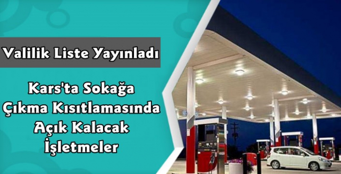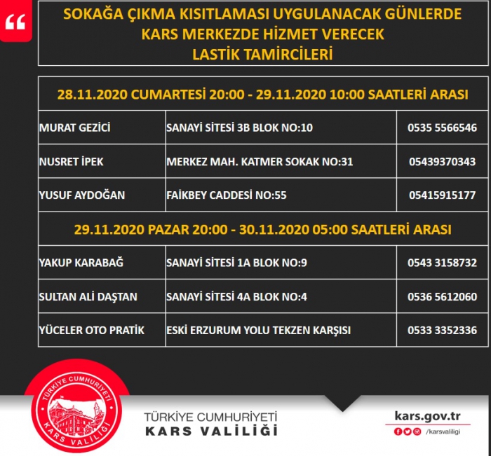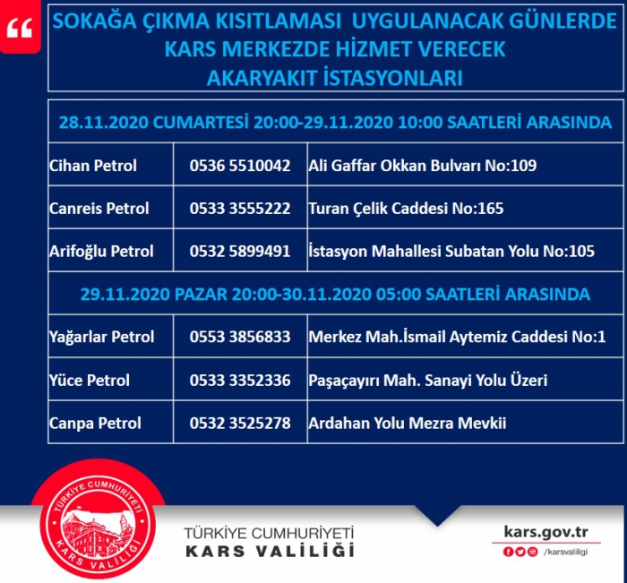 Kısıtlama kapsamında Kars Valiliği'nden yapılan açıklamada 28 Kasım cumartesi günü saat 20:00 ile 29 Kasım saat 10:00 saatleri arasında Cihan Petrol, Canreis Petrol, Arifoğlu Petrol ile farklı konumlarda 3 oto lastik tamircisi hizmet verecek.