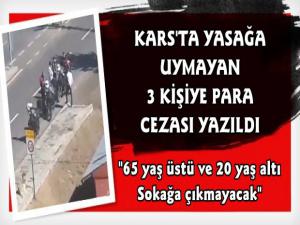 İçişleri Bakanlığı tarafından koronavirüs tedbirleri kapsamında 65 yaş üstü ve 20 yaş altı vatandaşların sokağa çıkması yasaklanırken Kars'ta yunus ekipleri tarafından bu kurala uymayan 3 kişiye ceza yazıldı.