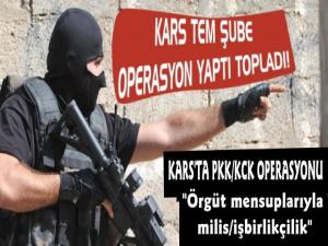 PKK/KCK terör örgütü mensuplarıyla irtibatlı ve iltisaklı oldukları, örgüt mensuplarına milis/işbirlikçilik faaliyetlerinde bulundukları tespit edilen 9 (dokuz) şüpheli şahıs 28/02/2018 tarihinde yapılan eş zamanlı operasyonlar neticesinde Kars/Kağızman ilçesinde yakalanmış, haklarında ^^ Silahlı Terör Örgütüne Üye Olma^^ suçundan yasal işlem başlatılmış olup şahıslar 13/03/2018 günü Adli Mercilere sevk edilmiştir.