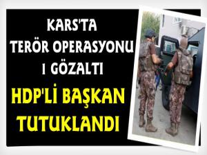 Kars Güncel- Kars İl Emniyet Müdürlüğü'nden yapılan yazılı açıklamadaSilahlı Terör Örgütüne Üye Olma suçundan hakkında soruşturma yürütülen Kağızman Halkların Demokratik Partisi (HDP) İlçe Başkanı Y.Ö isimli şüpheli, Kars İl Emniyet Müdürlüğü Terörle Mücadele Şube Müdürlüğünce 17.07.2019 günü saat 05.00 sıralarında eş zamanlı operasyon neticesinde yakalanarak gözaltına alınmıştır.