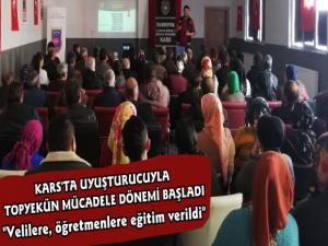 Kars Güncel- Yapılan açıklamada; "Kars Emniyet Müdürlüğümüz Narkotik Suçlarla Mücadele Şube Müdürlüğü ve İl Jandarma Komutanlığı ile müşterek olarak; Digor Dağpınar Çok Programlı Okulu toplantı salonunda, Sarıkamış Karaurgan lisesi toplantı salonunda okulda görevli Öğretmenlere ve öğrenci velilerine yönelik ve Susuz İlçemizde Resmi kurumlarda görevli personele yönelik Uyuşturucu ile Mücadele Eğitimi verilmiştir. Ayrıca katılımcılara"İki Ekmek" adlı kısa film izletilerek "UYUMA" uygulaması ile ilgili bilgilendirme yapılmıştır." denildi.