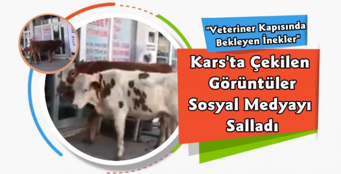 Kars Güncel-Bir vatandaşın telefonuyla kaydettiği görüntülerde iki ineğin ilçede bulunan veterinerinin kapısına dayandığı görülüyor.