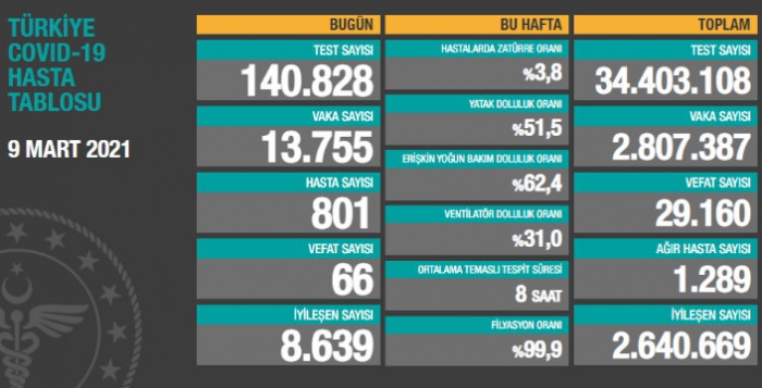 Sağlık Bakanlığı tarafından Türkiye'nin 9 Mart tarihli koronavirüs tablosu açıklandı. Açıklanan tabloya göre son 24 saatte 140 bin 828 test yapılırken, 13 bin 755 yeni vakanın olduğu ve 66 kişi virüsten dolayı yaşamını yitirdi.