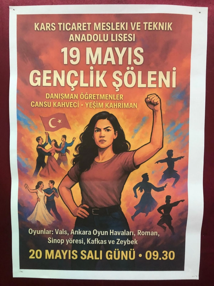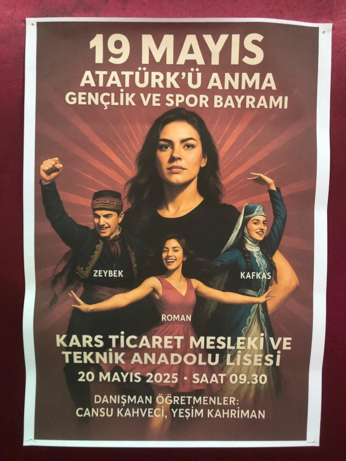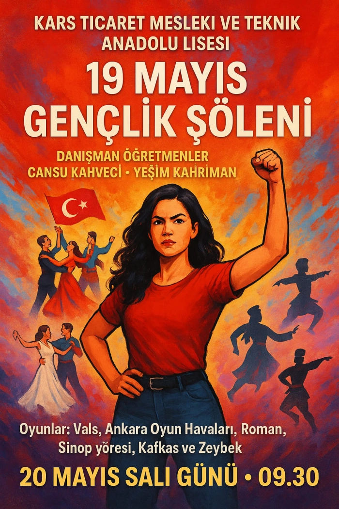 Kars Ticaret Mesleki ve Teknik Anadolu Lisesi, 19 Mayıs Atatürk'ü Anma, Gençlik ve Spor Bayramı'nı coşku dolu ve anlam yüklü bir programla kutladı. Üç hafta boyunca büyük bir özveriyle hazırlanan etkinlik, izleyenlere unutulmaz anlar yaşattı.