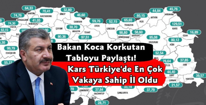 Kars Güncel- Sağlık Bakanlığı Türkiye'nin 5-11 Haziran 2021 tarihlerine ait 100 bin nüfusa göre vaka tablosunu açıkladı. Belirtilen tarihlerde Kars'ta vaka yoğunluğu 129,51'e yükseldi. Tabloya göre ilk sırada Kars yer alırken, Bolu, Eskişehir, Gümüşhane ve Tokat en yüksek vaka oranına sahip ilk beş il oldu.