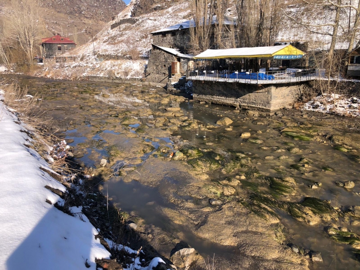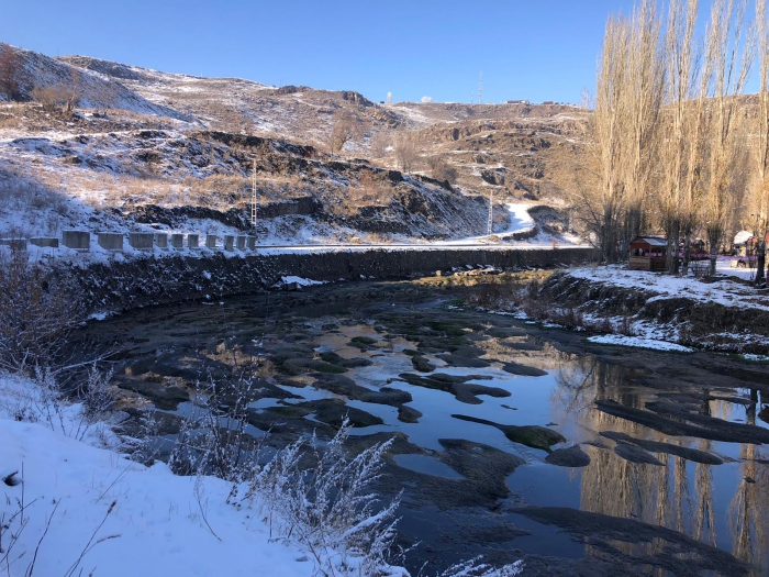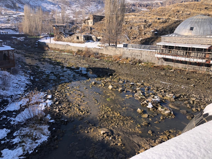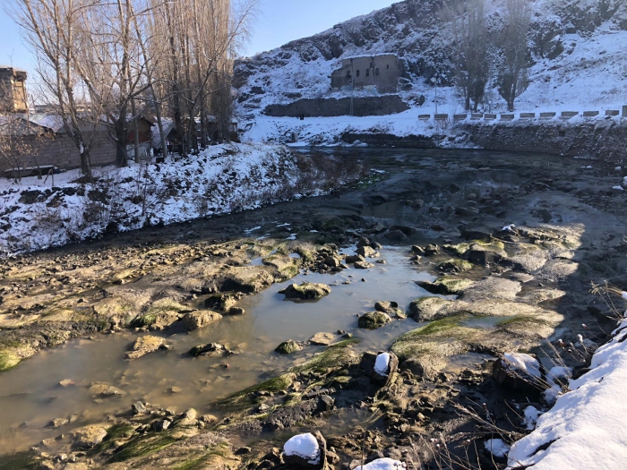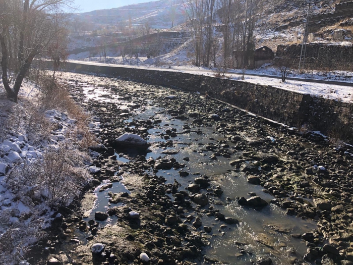 Kars Çayı'na uygulanan "Şişme Savak" çalışması ile Taş Köprü sonrasında su yatağı tamamen boşalınca Kars Çayının dibi görüldü.