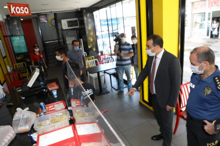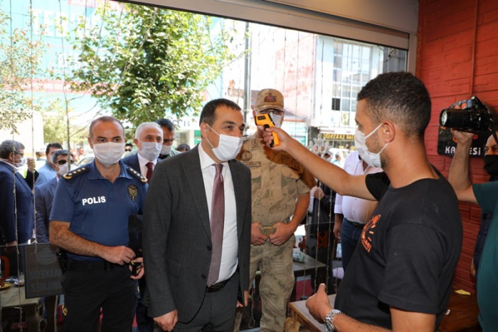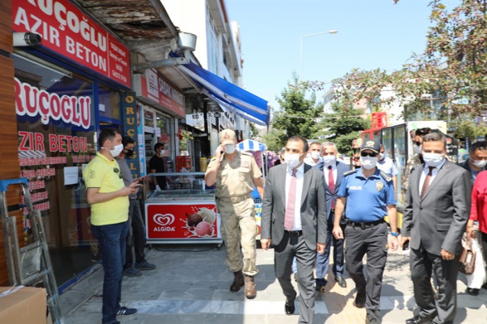 #SağlıkİçinHepimizİçin sloganıyla gerçekleştirilen denetime katılan Vali Türker Öksüz, Kazımpaşa ve Faikbey Caddesindeki esnafları ziyaret ederek maske, sosyal mesafe ve temizlik kuralları titizlikle uyulması konusunda esnaf ve vatandaşlara uyarılarda bulundu.
