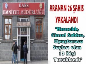 İl Emniyet Müdürlüğü'nden yapılan açıklamada, "Çeşitli suçlardan aranan toplamda 26 şahıs yakalanmış bu şahıslardan haklarında Yağma ve Uyuşturucu Madde Ticareti Yapma, Silahla Tehdit ve Hırsızlık, Dolandırıcılık, Cinsel Saldırı, Cezaevi Firarisi, İhaleye Fesat Karıştırma, Yaralama, Uyuşturucu Madde Ticareti Yapma, Trafik Güvenliğini Tehlikeye Sokma, Nafaka Hükümlerini Uymama ve Hırsızlık suçlarından kesinleşmiş hapis cezası bulunan 13 şahıs tutuklanarak cezaevine teslim edilmiştir." denildi.