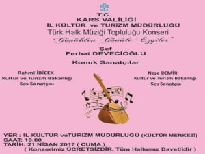 21 Nisan 2017 Cuma günü Kültür Merkezinde saat 19.30'da İl Kültür ve Turizm Müdürlüğü Türk Halk Müziği Topluluğu tarafından "Gönülden Gönüle Ezgiler" temalı konser düzenlenecektir. Kültür ve Turizm Bakanlığı Türk Halk Müziği Sanatçıları Rahmi İBİCEK ile Neşe DEMİR'in konuk sanatçı olarak yer alacağı konser ücretsiz olup, tüm halkımız davetlidir.