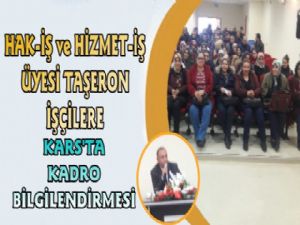 Yapılan toplantıda taşeron işçisine hükümet olarak müjdelenen kadro hakkında sosyal medyalarda ve çevrede dolaşan kirli bilgilerden arındırmak adına üyeler ile bir araya gelindi. Düzenlenen bilgilendirme toplantısında Hak iş konfederasyonu ve hizmet iş sendikası Kars il başkanı Fikret Kepenekçi ve Enerji-İş İl Temsilcisi Soner Akdemir ve çok sayıda sendika üyesi katıldı.
