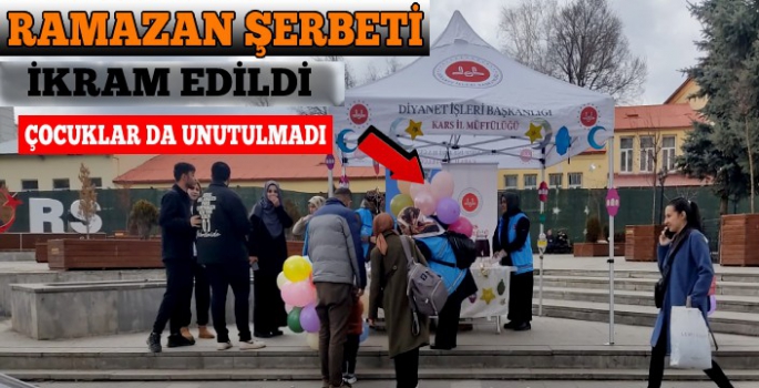On bir ayın sultanı Ramazan-ı Şerif’e bir gün kala Kars’ın işlek caddelerinden olan Faikbey Caddesi Gazi Ahmet Muhtar Paşa (GAMP) Konağı yanında kurulan stant içerisinde caddeden geçen vatandaşlara ramazan şerbeti ikram edilirken, çocuklar da şerbetin yanı sıra balonlarla mutlu edildi.
