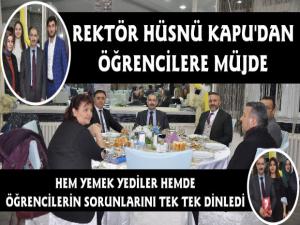 Daha sonra öğrencilerin söz aldığı yemek programında, Rektör Kapu öğrencilerin sorunlarını dinleyerek not aldırttı. Karşılıklı fikir alışverişi şeklinde geçen yemeğin sonunda Kafkas Üniversitesi Rektörü Prof. Dr. Hüsnü Kapu, öğrencilere yakında 24 saat hizmet veren bir kütüphanenin olacağı müjdesini verdi.
