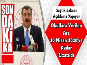 Milli Eğitim Bakanı Ziya Selçuk yaptığı açıklamada; "Okullarda eğitime verilen aranın 30 Nisan 2020 tarihine kadar uzatıldığını duyurdu.