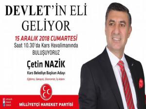 Kars Güncel- Seçim çalışmalarına başlamak üzere 15 Aralık Cumartesi günü saat 10.30da Karsa gelecek olan MHP Kars Belediye Başkan adayı Çetin Nazik, Harakani Havaalanında karşılanacak.