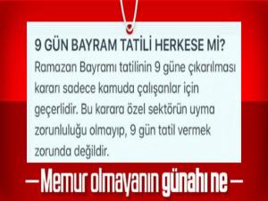 Özel sektör çalışanları için ise karar, işverenin elinde. İşveren 3 Haziran ve 7 Haziran'ı tatil yaparsa, özel sektör çalışanları da 9 gün tatil yapabilir.