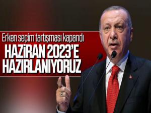 Erdoğan yaptığı açıklamada, "Defaatle söyledim, Cumhur İttifakımızda sayın Bahçeli de söyledi. Bizim seçimimiz 2023 Haziran'dır. Buradan bizim sapmamız sözkonusu değildir. Bazı yalan yanlış tarih açıklayanlar kendilerini buğday ambarında sananlardır. Biz bu ülkede açıklanan tarihlerde seçim yapmasını birilerine öğreteceğiz. Bunu öğrenecekler. Şu anda hazırlıklarımızı 2023 Haziran'ına yapıyoruz. Kongrelerimiz yürüyor şu anda." dedi.