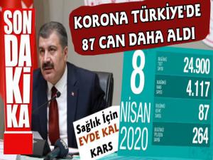 Bakanlıktan yapılan açıklamada; Bugün yapılan 24 Bin 900 test sonucuna göre 4117 yeni pozitif vakanın tespit edildiği, 87 kişininde yaşamını yitirdiği ve bugün iyileşen hasta sayısının 264 olduğu belirtildi.