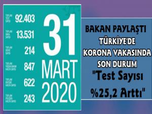 Sağlık Bakanlığı verilerine göre bugün itibariyle Türkiye'de toplam 92 Bin 403 test yapıldığı, 13 Bin 531 kişinin pozitif vaka olduğu, toplamda 214 kişinin koronavirüs nedeniyle yaşamını yitirdiği belirtildi.