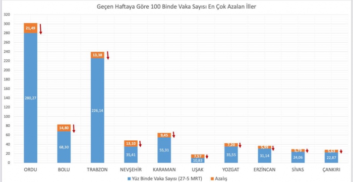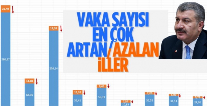 En Çok Artan ve Azalan İller Bakan Koca açıklamasında; "Son hafta 100.000 nüfusta vaka görünme oranı en çok artan illerimiz: Sinop, Kilis, Samsun, Amasya ve Edirne. En çok azalan illerimiz: Ordu, Bolu, Trabzon, Nevşehir ve Karaman. Birlikte tedbirlere uyarak tüm illerimizi mavi kategoriye sokalım." dedi. dedi.