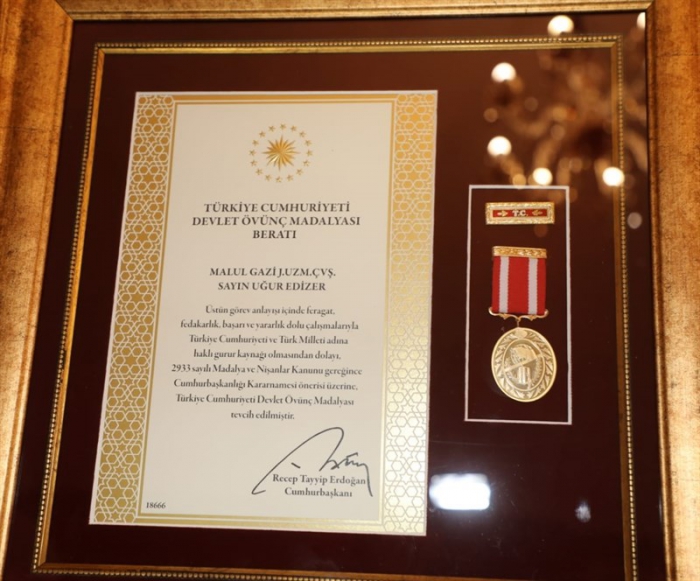 Kars Güncel- Vali Türker Öksüz, üstün görev anlayışıyla, feragat, başarı, fedakarlık ve yararlık dolu çalışmalarından dolayı Malul Gazi Jandarma Uzman Çavuş Uğur Edizer’e tevcih edilen “Devlet Ödünç Madalyası”nı Cumhurbaşkanı Recep Tayyip Erdoğan adına kendisine takdim etti.