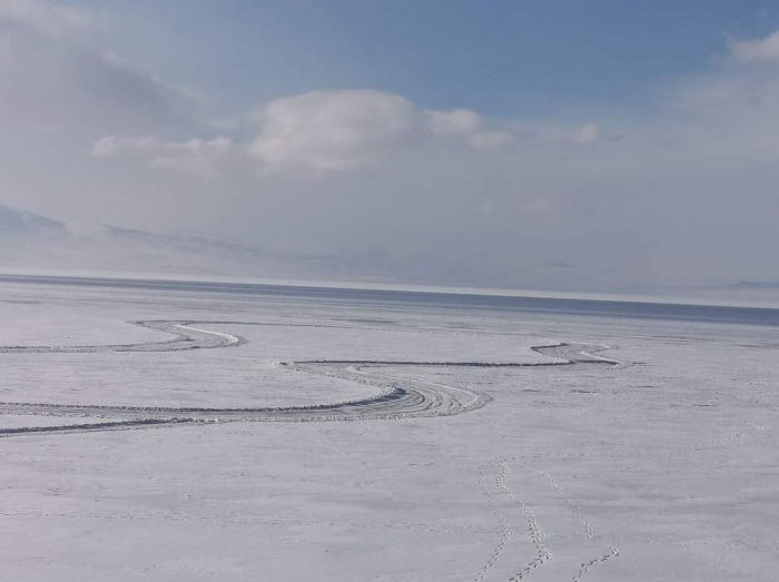 Kars Arpaçay Kütük ev açıklarında özel bir şirkette ait otomobil firması için buz üstünde kar küreme aleti takılan traktör buzun kırılması sonrası Gölün karanlık sularına gömülerek kayboldu.